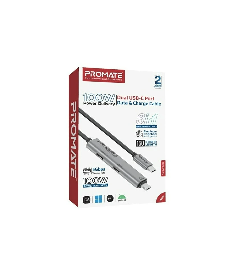 Introducing Promate’s PortLink-C3, the ultimate 3-in-1 USB-C Cable with an integrated dual USB-C port hub, designed to revolutionize your connectivity experience. With a high-speed 5Gbps USB-C connector and 100W power delivery, this cable ensures ultra-fast data transfer and efficient charging. The dual USB-C ports offer versatile functionality, with one port providing 5Gbps data transfer and the other supporting 480Mbps. Its innovative and compact design, paired with a 1.5m length, offers flexibility and convenience for any setup. Constructed from durable aluminum and plastic materials, the PortLink-C3 promises longevity and reliability. Enjoy seamless, plug-and-play connectivity with the PortLink-C3, the perfect blend of style and performance.