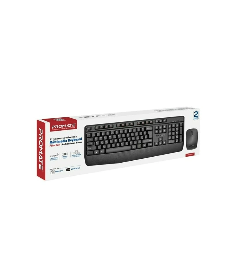 Promate Wireless Ergonomic Multimedia Keyboard With Palm Rest & Ambidextrous Mouse #Procombo-14 Black