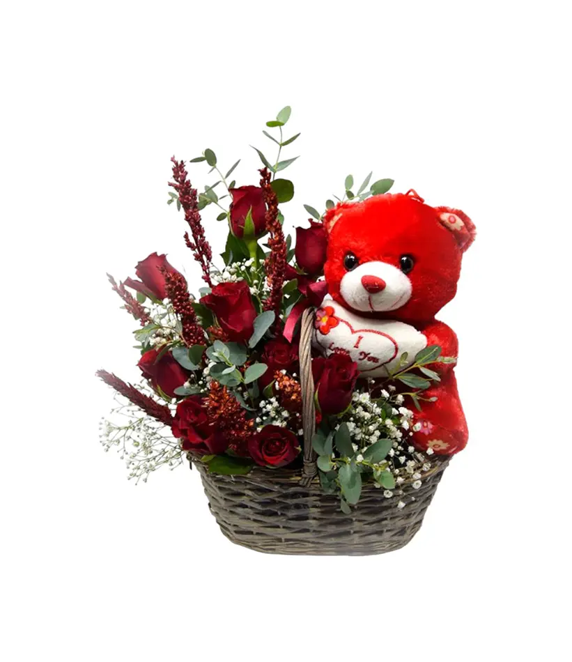A Basket Of 10 Red Flowers And a Teddy Bear